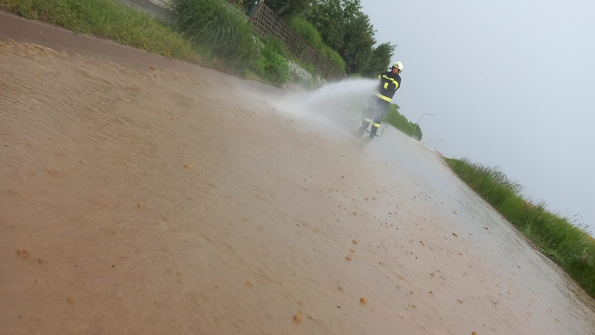 Aufgrund des starken Unwetters war die Straße mit Schlamm verschmutzt worden. Mithilfe des Hochdrucklöschsystem des TLFA wurde der Schlamm von der Straße entfernt.